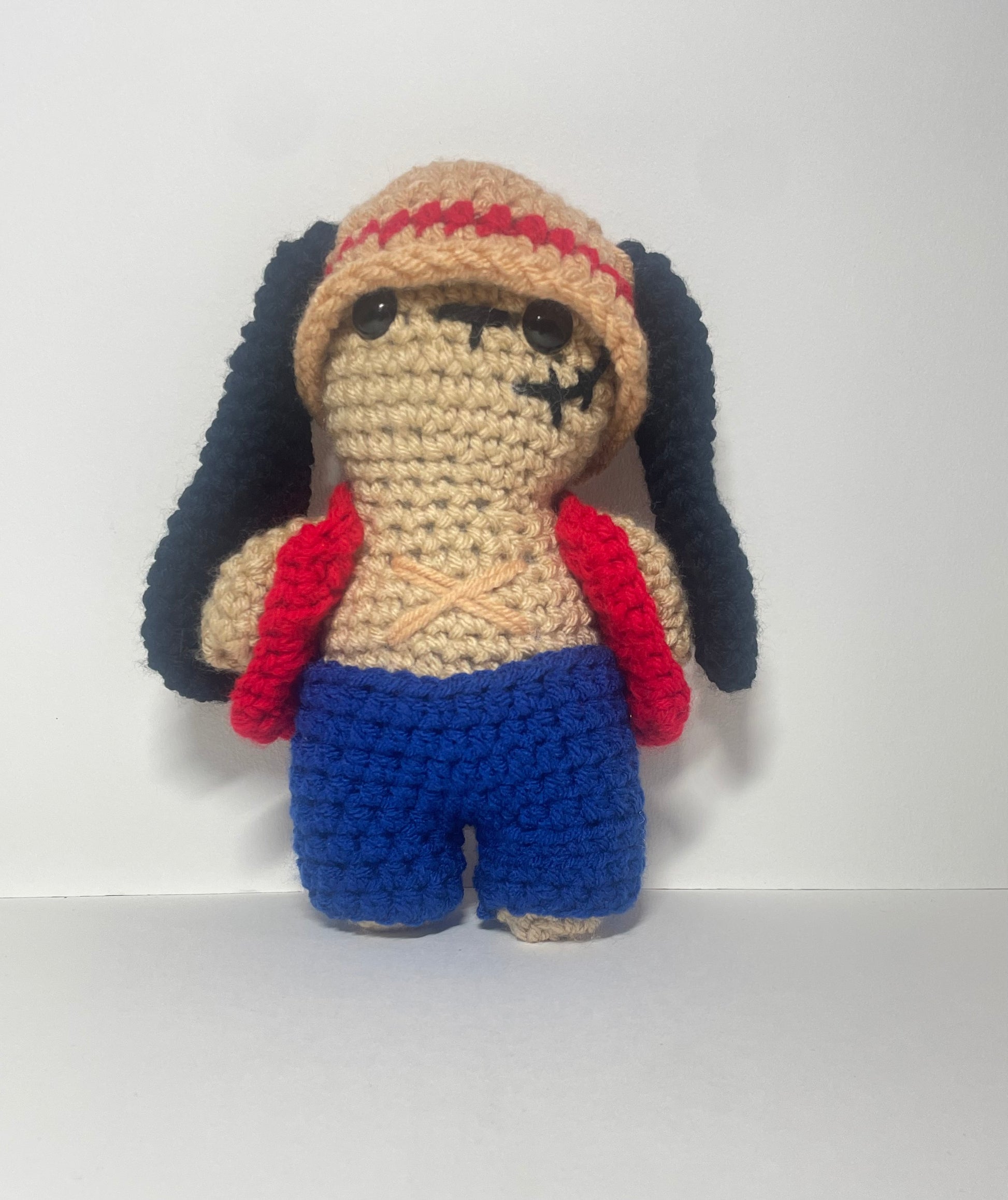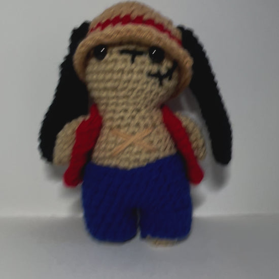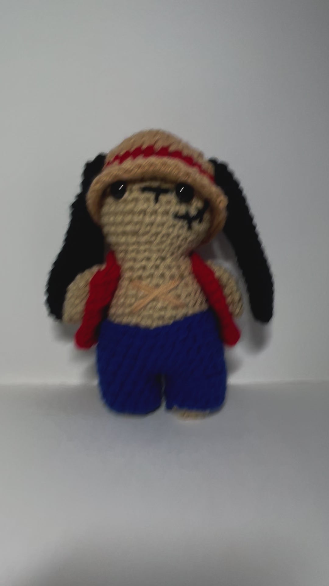 Set sail with Luffy Bunny, the fearless and stretchy little captain from the Bun Piece Collection! Inspired by your favorite straw-hatted pirate, this handmade crochet bunny is bursting with charm, adventure, and personality. Complete with a tiny red vest, mini hat, and the spirit of a true hero, Luffy Bunny is ready to find the One Plushie Treasure with you.